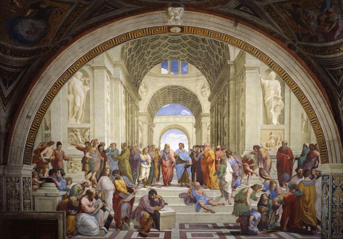 聆听导游讲述拉斐尔画室及其著名壁画的故事,包括广为人知的《雅典学院》。