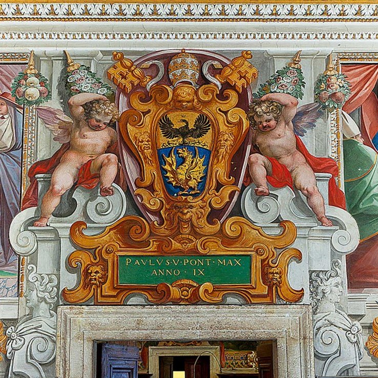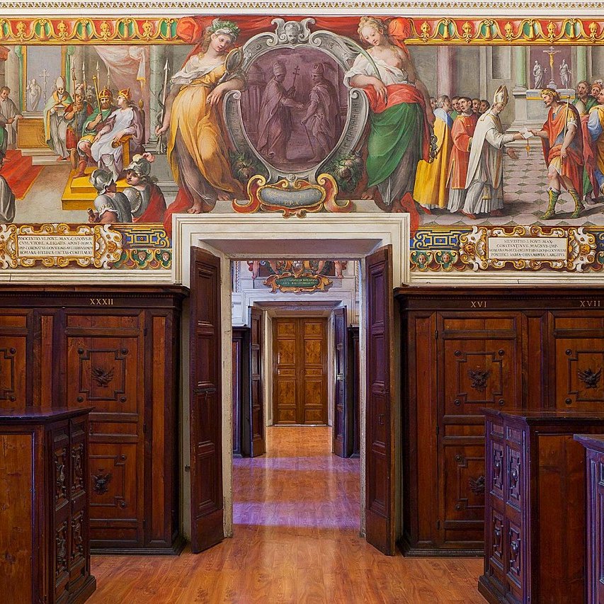 The three Pauline Rooms were the first home of the 'new' Pontifical Archives of the Holy See, established by Paul V Borghese between 1610 and 1612. Already used as the residence of the cardinals librarians of the Holy Roman Church, they had remained unused after the death of Cardinal Cesare Baronio in 1607. The rooms were furnished with poplar cabinets bearing the coats of arms of the Borghese family and frescoed in the upper part with a cycle of historical scenes. The protagonist of almost every scene is a written document, whose preservation was ensured by the archives, an instrument of government and protection of the spiritual and territorial interests of the Roman Church.