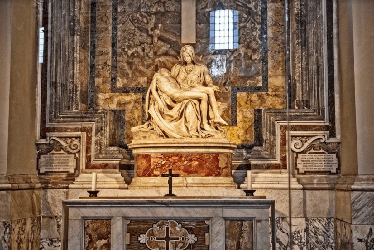 Petrusbasiliek en ziet u de koepel die door Michelangelo is ontworpen. Tussen de vele kunstwerken bevinden zich Michelangelo's 'Pietà' en Bernini's immense bronzen sculptuur 'Baldachin', die boven het hoofdaltaar staat en vermoedelijk boven de rustplaats van Sint-Petrus is geplaatst.